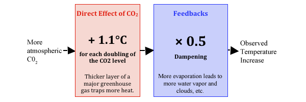 Die Auswirkung der Rückkopplungen lässt sich nur schwer mit einem empirischen Beweis nachweisen, weil es viel mehr Kräfte gibt, die die Temperatur beeinflussen als nur eine Änderung des CO2-Niveaus, aber es scheint eine Multiplikation irgendwo zwischen 0,25 und 0,9 zu sein. Der Einfachheit halber haben wir hier den Wert 0,5 benutzt.