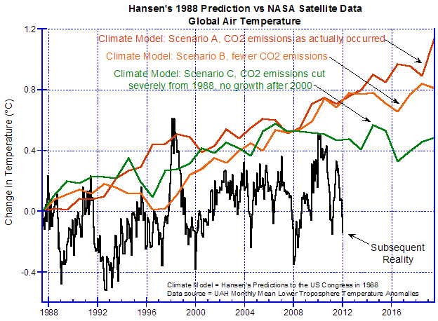 Abbildung 3: Hansens Vorhersagen http://wattsupwiththat.com/2012/02/26/the-skeptics-case/ – sdendnote6sym6 vor dem US-Kongress 1988, verglichen mit den nachfolgenden tatsächlichen Temperaturen, gemessen durch NASA-Satelliten http://wattsupwiththat.com/2012/02/26/the-skeptics-case/ – sdendnote7sym7.