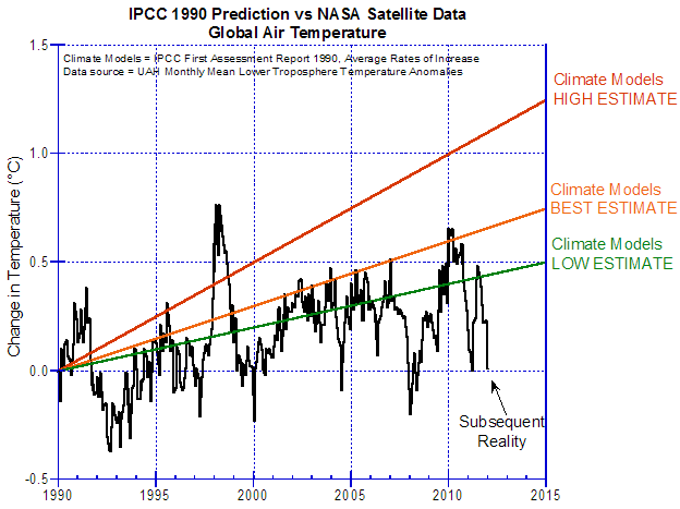 Abbildung 4: Vorhersagen des IPCC in seinem ersten Zustandsbericht 1990, verglichen mit den nachfolgenden Temperaturmessungen durch NASA-Satelliten