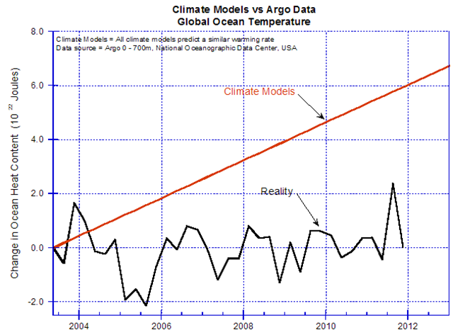 Abbildung 5: Vorhersagen von Klimamodellen http://wattsupwiththat.com/2012/02/26/the-skeptics-case/ – sdendnote11sym11 der Ozeantemperatur im Vergleich mit den Messungen durch Argo http://wattsupwiththat.com/2012/02/26/the-skeptics-case/ – sdendnote12sym12. Die Einheit der vertikalen Achse ist 1022 Joules (etwa 0,01°C)