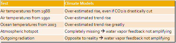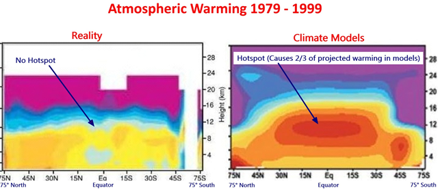 Die Klimamodelle waren durch die Bank falsch. Der fehlende Hotspot und die Daten der Ausstrahlung beweisen beide unabhängig voneinander, dass die Verstärkung in den Klimamodellen in Wirklichkeit nicht vorhanden ist. Ohne die Verstärkung würden die Temperaturvorhersagen der Klimamodelle um mindestens zwei Drittel niedriger ausfallen. Dies würde erklären, warum sie die gegenwärtigen Luft- und Wassertemperaturen so überschätzt haben.