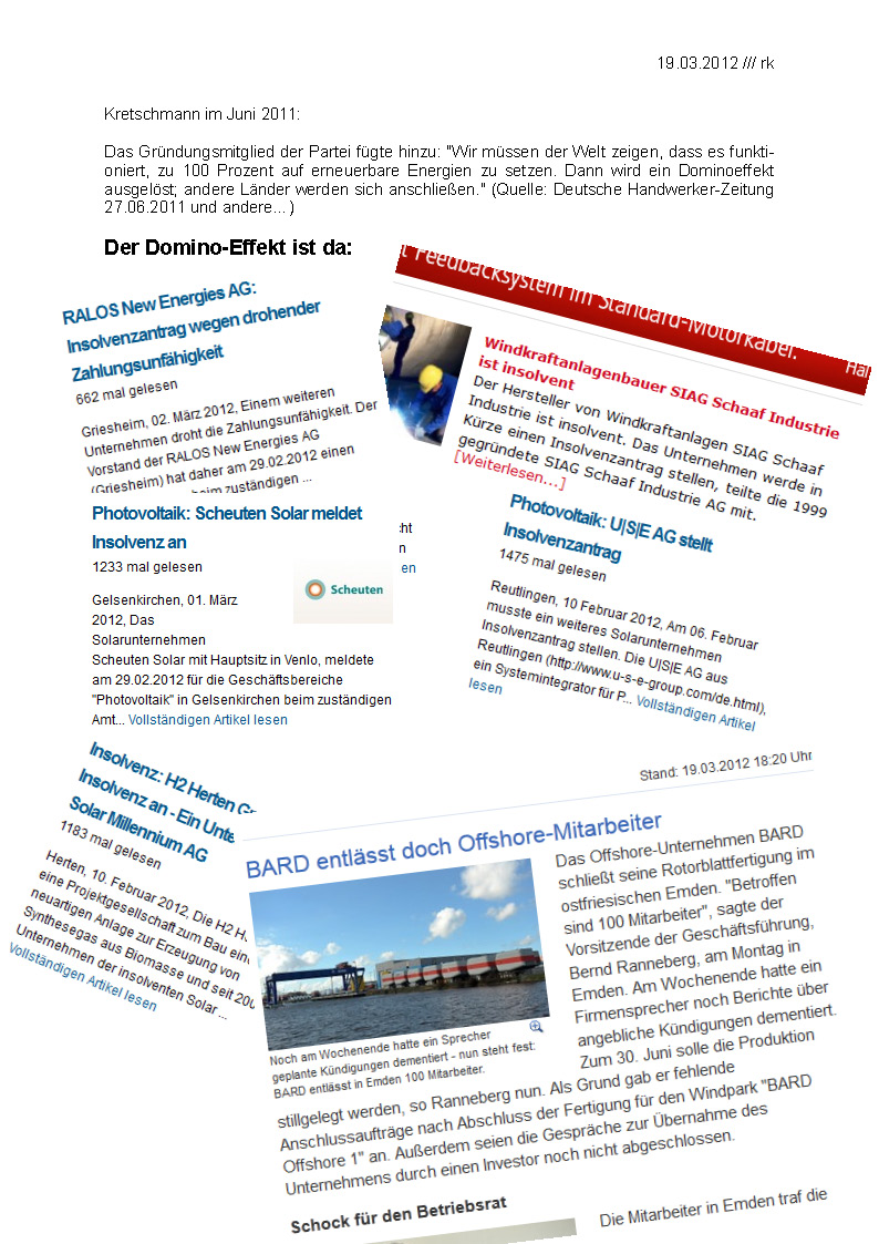 Dotcom lässt fern grüßen wobei ja nicht jeder der zumacht ursächlich mit der vermaledeiten Energiewende zu sehen ist, da es immer noch auch unternehmerische Fehlentscheidungen auch bei „boomenden“ Branchen gibt. Man müsste eigentlich auch quantifizieren wie viele denn wegen der EE-Hype und deren Bevorteilung durch Benachteilung anderer zum finalen Schuss kamen und sei es „nur“ wegen exorbitanter Energiekosten… man hört von den glorreichen Protagonisten immer nur wie viele Arbeitsplätze denn durch EE geschaffen würden und gerade ja das Handwerk beanstandet ja die Tage wieder lautstark das vermeintliche Zögern der Politik und das „kontraproduktive“ Kürzen der Förderung… … wahrscheinlich muss ja deswegen Solarhybrid ja dran glauben wer es denn glauben möchte …