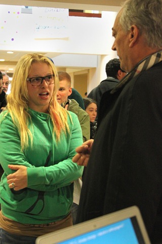 Erin Delman, Vorsitzende des Umweltvereins, diskutiert mit Monckton – Photo von Charlotte Lehman