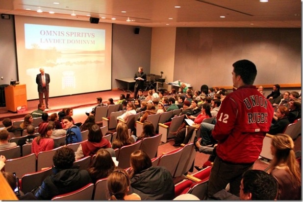 Ein Student stellt Lord Monckton während der anschleißenden Fragestunde eine Frage. Photo von Charlotte Lehman