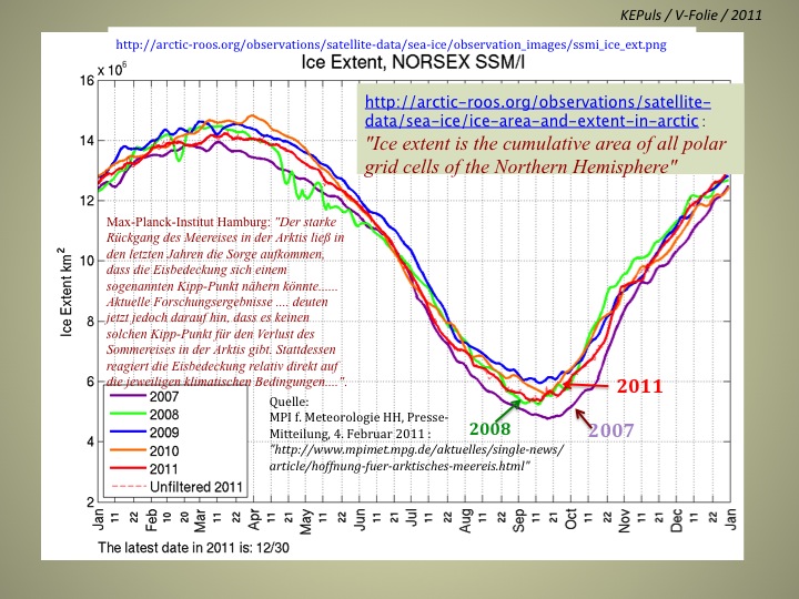Trotzalledem: Selbst angesichts dieser beachtlichen winterlichen Eis-Ausdehnung würden wir uns hier niemals anmaßen – im Gegensatz zu den IPCC-Forschern und deren Instituten – nun daraus eine September-Prognose abzuleiten. Keineswegs kann man u.E. nun zum Beispiel auf ein "10-Jahres-Maximum an Eis" im September 2012 schließen. Allerdings – das ist auch gar nicht erforderlich, um die Dreistigkeit und Peinlichkeit der bisherigen Arktis-Prognosen von IPCC-nahen Instituten darzustellen – schon bis heute war alles falsch!