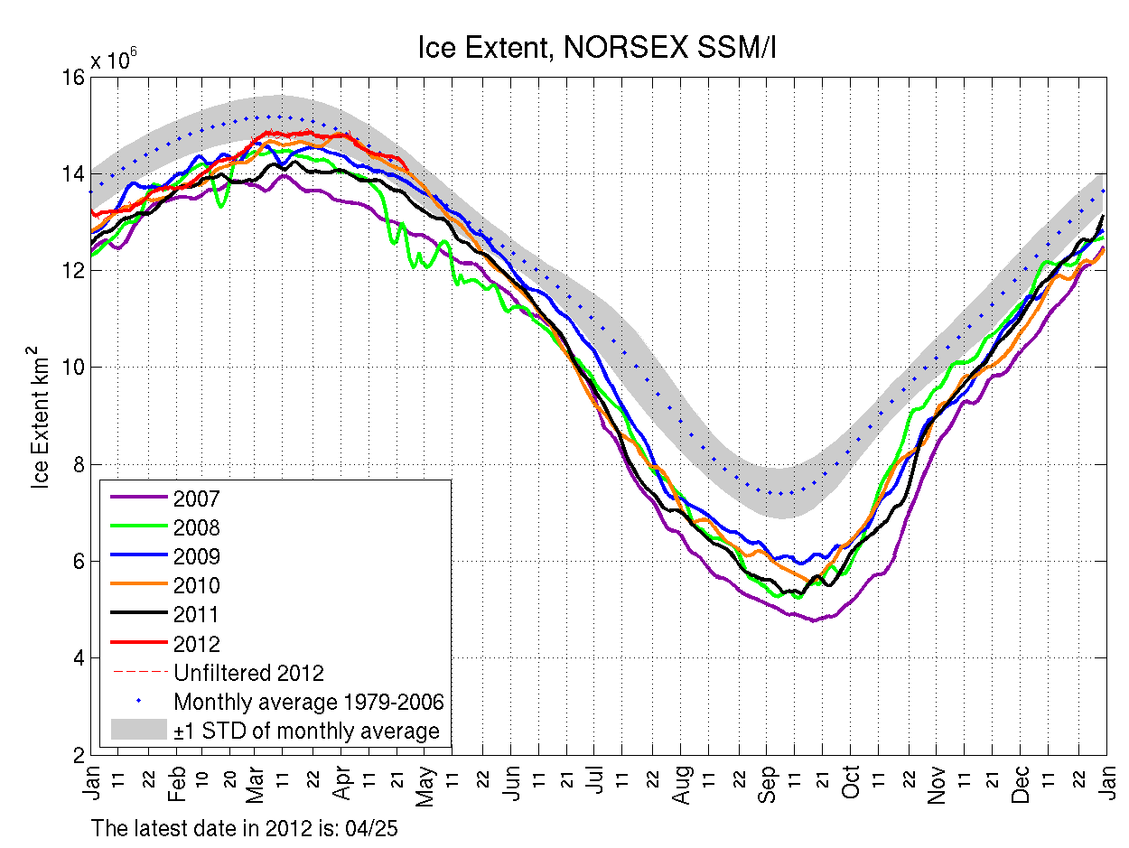Update 13.5.12: Vor fünf Jahren prophezeiten "Wissenschaftler" in National Geographics, dass die Arktis bis zum Ende des Sommers 2012 nahezu eisfrei sein würden. Davon ist weit und breit nichts zu sehen. Das Gegenteil ist der Fall. Mark Serreice, der spätere Leiter des ICE Center in Boulder Colorado machte sich darin unsterblich lächerlich mit dem Satz: "Die Arktis weint" Details dazu hier.