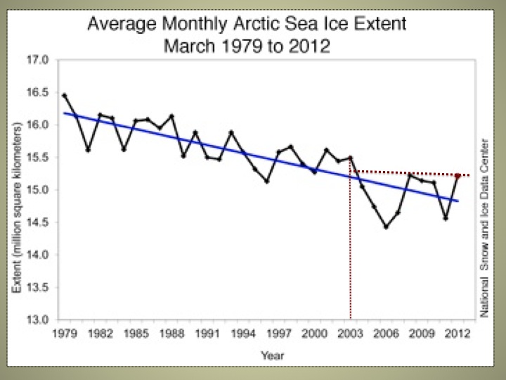 Eine andere Darstellungsart zeigt die jährliche arktische Eis-Ausdehnung in den März-Monaten 1979-2012 in der Abbildung 4: