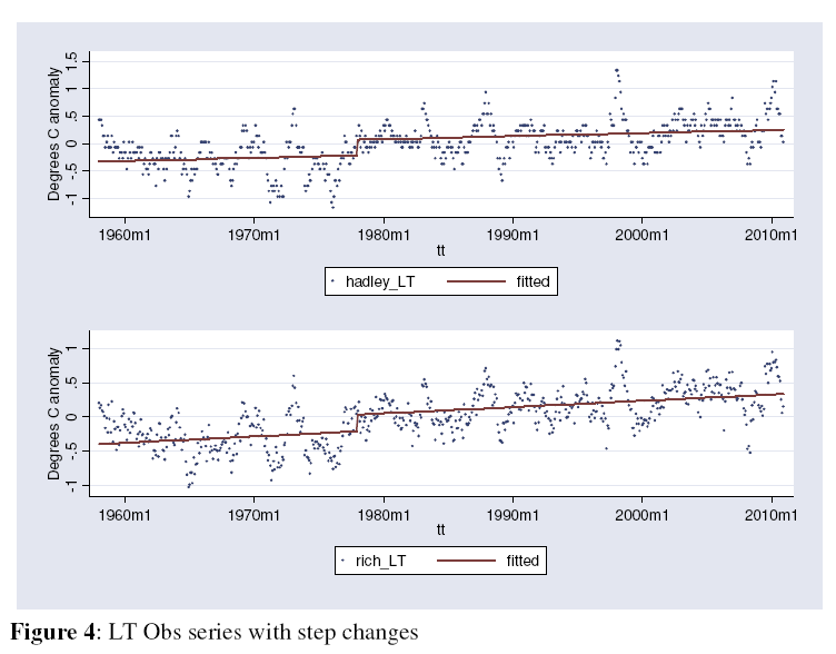 Das Problem mit Stufenänderungen besteht darin, dass zwei flache Linien mit einem stufenartigen Anstieg dazwischen künstlich einen linearen Trend erzeugen, der bedeutungslos ist. McKitrick und Voselgang [i] nehmen sich dieser Stufenänderung an und zeigen, dass es in der unteren und mittleren Troposphäre von 1958 bis 2005 nur dann zu einem Erwärmungstrend kommt, wenn man die Stufenänderung mit einbezieht. Entfernt man diese, ist der zugrunde liegende Trend nicht signifikant. Mit anderen Worten, in 46 der 47 Jahre mit atmosphärischen Daten wird kein bedeutsamer steigender Trend erzeugt.