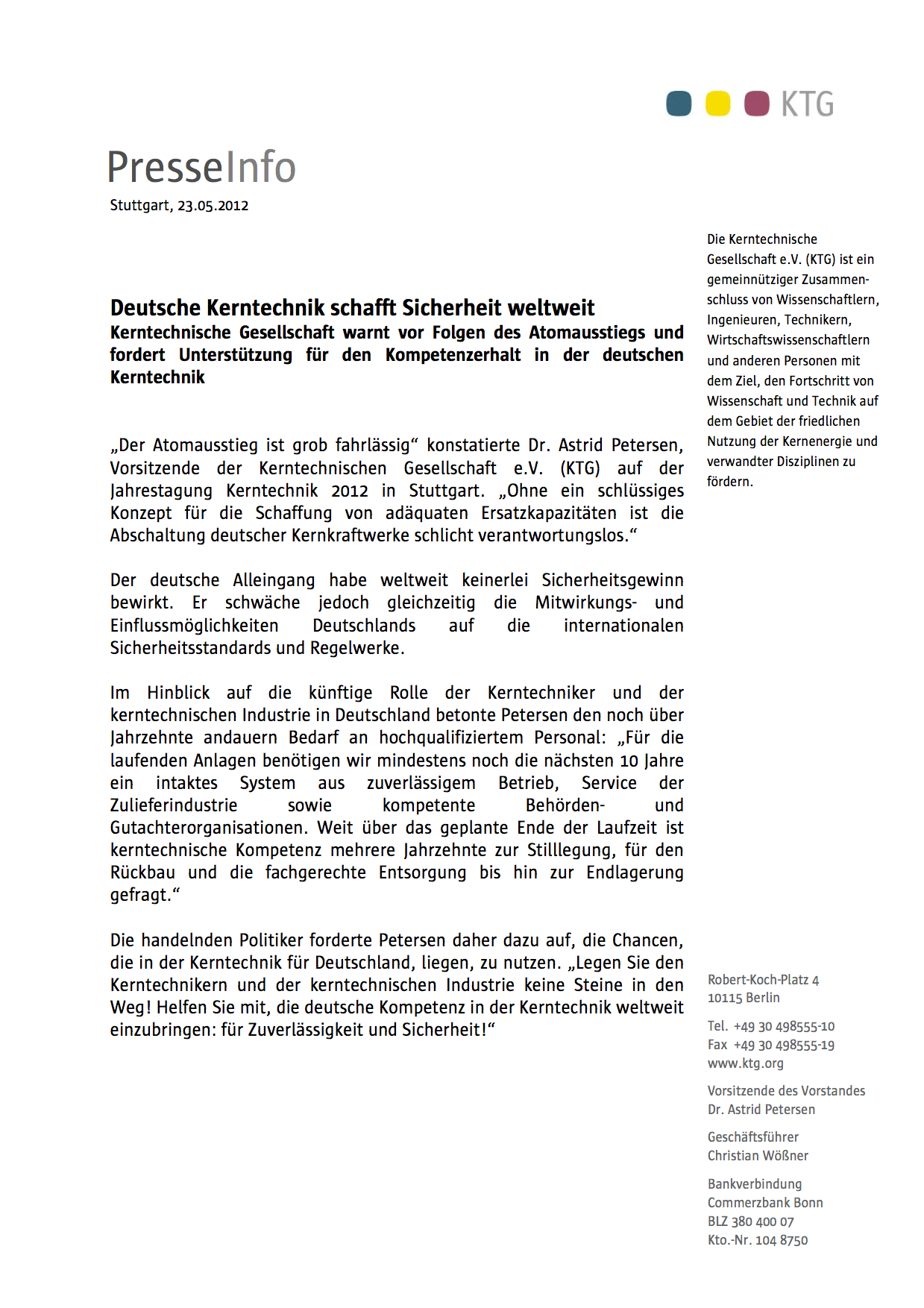 Lesen Sie dazu auch die Stellungnahme der Deutschen Kerntechnischen Gesellschaft KTG : Kerntechnische Gesellschaft warnt vor Folgen des Atomausstiegs und fordert Unterstützung für den Kompetenzerhalt in der deutschen Kerntechnik
