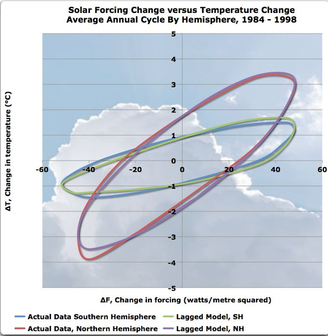 Dann habe ich die Änderungen in diesem Netto-Sonnenantrieb (nach Albedo Reflektionen) gegen die entsprechenden Temperaturänderungen geplottet, jeweils für die Hemisphären.