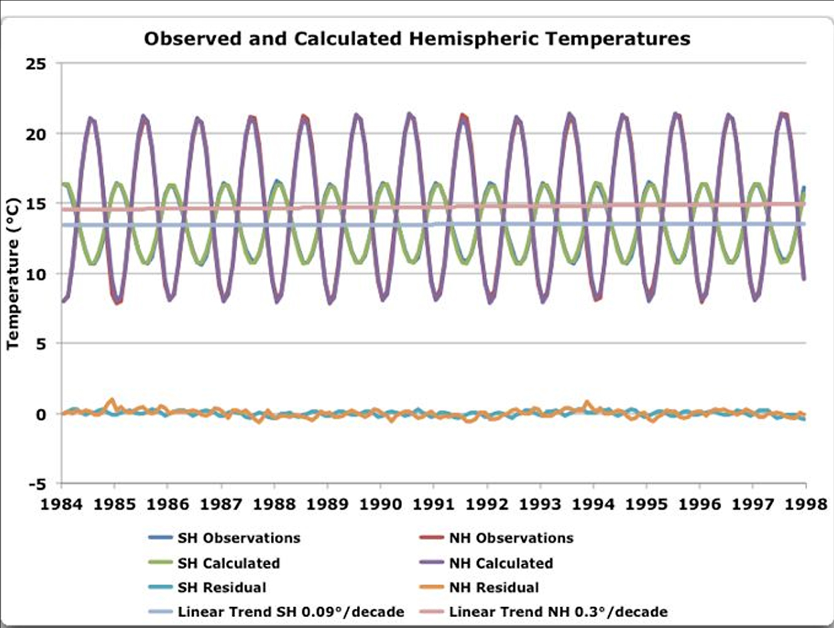 Viertens, es gibt keinen signifikanten Trend in den Resten aus Errechnetem minus Messwerten weder für die NH noch für die SH.