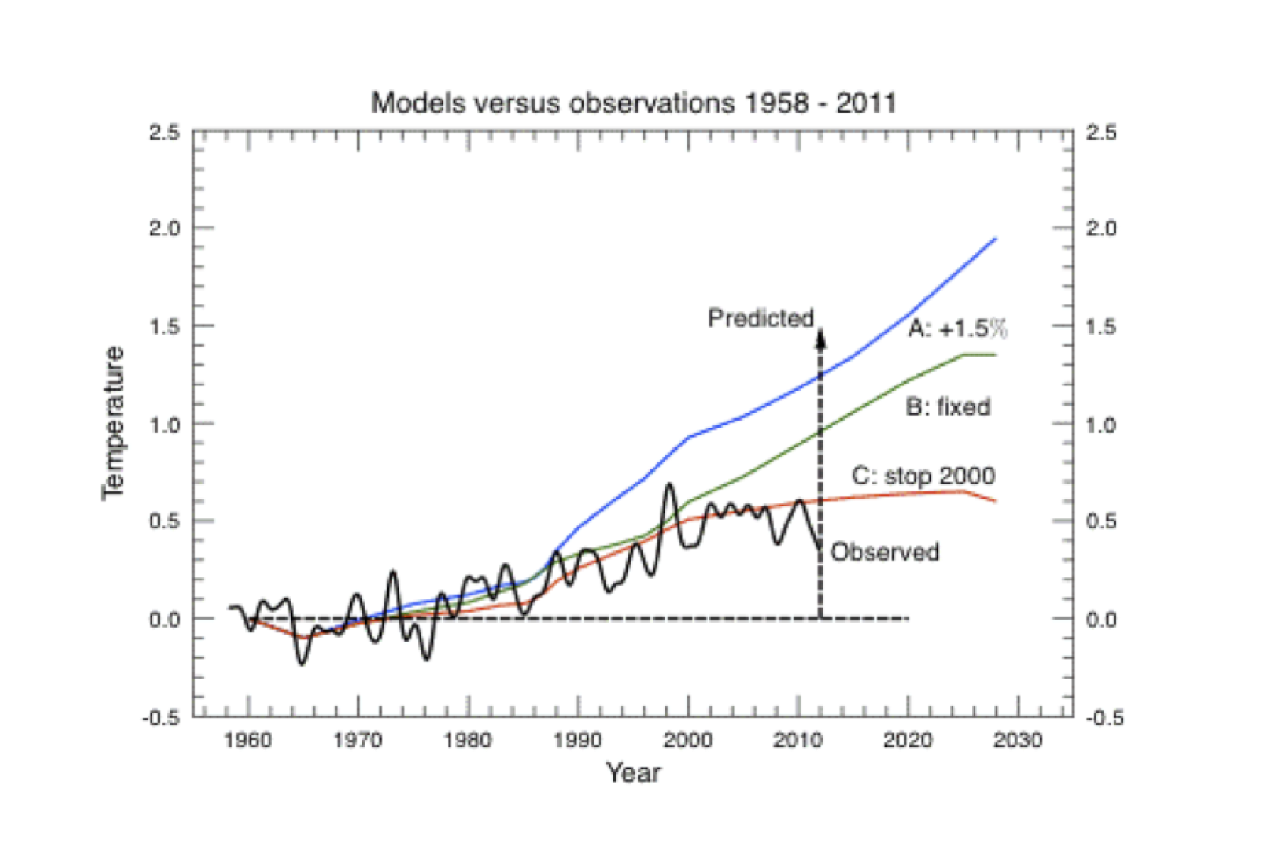 Die CO2-Emissionen sind seit dem Jahr 2000 um jährlich etwa 2,5 Prozent angestiegen, so dass wir gemäß dem Hansen-Paper einen Temperaturanstieg erwarten würden, der stärker als in Modell A ausfallen sollte. In Abbildung 1 sind die drei Hansen-Szenarien sowie die real gemessene globalen Temperaturkurve dargestellt. Der über Szenario A hinausragende Pfeil stellt den Temperaturwert dar, den das Hansen-Team auf Basis einer CO2-Erhöhung um 2,5% vorhergesagt hätte. Laut der Hansen-Prognose müsste die Temperatur gegenüber dem Vergleichsniveau in den 1970er Jahren um 1,5°C angestiegen sein. In Wahrheit hat sich die Temperatur jedoch lediglich um 0,6°C erhöht.
