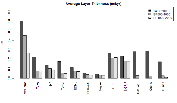 Die Law Dome-Aufzeichnung, die von Gergis und Karoly aussortiert worden war, ist eine außerordentlich wichtige Darstellung, weil sie meines Wissens nach die bisher längste Holozän-Reihe ist mit einer Auflösung, die fast 10 mal größer ist als die anerkannte Wostok-Aufzeichnung (Die Akkumulation hängt direkt mit der Auflösung zusammen: hohe Akkumulation ermöglicht hohe Auflösung). Die Graphik unten vergleicht die Gletscherdicke einiger prominenter Stellen in drei Zeiträumen: 1500 bis 2000, 1000 bis 1500 und 0 bis 1000. Die Auflösung während der letzten zwei Millenien ist fast doppelt so hoch wie die Auflösung der Bohrkerne GRIP und NGRIP aus Grönland, die Gegen­stand intensiver Forschung und Veröffentlichung waren.