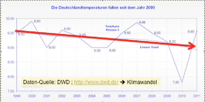 Die Prognosen dieses Mannes mit den steigenden Temperaturen sind einfach falsch. Becker gehört zu denjenigen aus der oberen Spitze des DWD, die gegen die eigenen sorgfältig erhobenen DWD-Daten argumentieren. Seit 13 Jahren fallen die Temperaturen in Deutschland. In internen mails wird das durchaus zugegeben, dass 2000 das wärmste Jahr gewesen sei und das dürfe auch jeder wissen. Nur der DWD selbst sorgt z.B. durch den Herrn Becker dafür, dass dies keiner öffentlich erfährt.Dieser Mann erklärt genau das Gegenteil: „Trotz steigender Temperaturen…“ Zur Erklärung dieser Falschaussage gibt es zwei Möglichkeiten: 1) Der dWD hat einen Auftrag der Regierung diese Abkühlung zu verheimichen oder 2) Der Mann fühlt sich aus beruflichen Gründen berufen, im vorauseilenden Gehorsam die Regierungsmeinungen zu bestätigen. Das soll ja bei einer Karriere schon geholfen haben. Die obige Temperatur-Grafik im Artikel mit der fallenden Trendlinie, wir (Leistenschneider/Kowatsch) haben diese in unseren vielen Artikeln erstmals verwendet) ist dem DWD nicht unbekannt. Noch niemals gab es dazu eine Kommentierung, obwohl die DWD-Leute meine persönliche mailadresse haben. Die Antwort ist einfach „Abtauchen“.