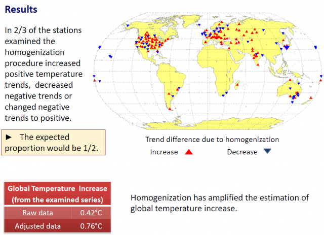 Bei zwei Drittel aller untersuchten Stationen erzeugte der Homogenisierungsprozess zunehmende positive Temperaturtrends, abnehmende negative Trends oder Veränderungen des Trends von negativ zu positiv.