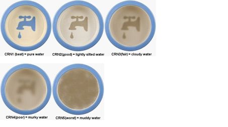 Hier folgt ein anschauliches Beispiel, den Homogenisierungsprozess anschaulich zu machen. Man stelle ihn sich wie die Messung der Verschmutzung von Wasser vor. Hier folgt eine einfache Tafel mit einer Qualitätsbewertung von CRN-Stationen (CRN station quality ratings) und wie das aussehen könnte, wenn man die Trübung durch Wasserverschmutzung mit einer Bewertung von 1 bis 5 (beste <-> schlimmste Note) versieht:
