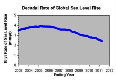 Abbildung 4 zeigt die Anstiegsraten pro Jahr über die letzten 20 Jahre. Der Anstieg des Meeresspiegels hat sich deutlich verlangsamt. Von einem beschleunigten Anstieg kann demnach keine Rede sein, Quelle: WUWT, “Sea Level Rise and Solar Activity“.