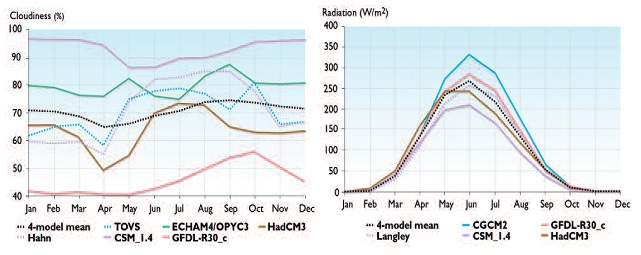 Abbildung 5 zeigt nach diversen Modellberechnungen (alle mit Hochleistungsrechnern, sog. Supercomputern durchgeführt) der Wolkenbedeckung (links) und der solaren Einstrahlung (rechts) im Zeitraum von 1981 – 2000 von 70° – 90° nördlicher Breite. “TOVS“ zeigt die mittels Satellit aufgenommenen Vergleichsdaten beim Bedeckungsgrad und “Langley“ die Beobachtungsdaten der solaren Einstrahlung. „Bemerkenswert“ ist die Übereinstimmung der solaren Einstrahlung für die Monate November bis Februar. Diese kommt indes einzig dadurch zustande, dass die solare Einstrahlung im Winter in den Polargebieten bekanntermaßen gleich Null ist.