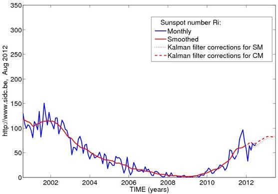 Wie die folgende Graphik vom SIDC zeigt, beträgt die gegenwärtige Solaramplitude etwa 60 auf dem Weg zum solaren Maximum, das im Mai 2013 erwartet wird: