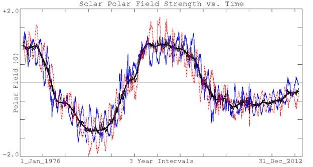 Parallel dazu zeigt die die Stärke des solaren Polarfeldes (vom Wilcox Solar Observatory), dass es noch bis zu einem Jahr dauern könnte, bis das solare Maximum erreicht ist: