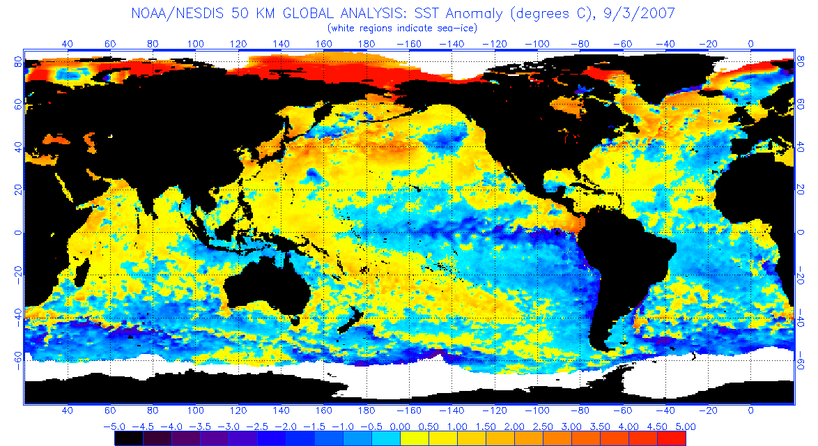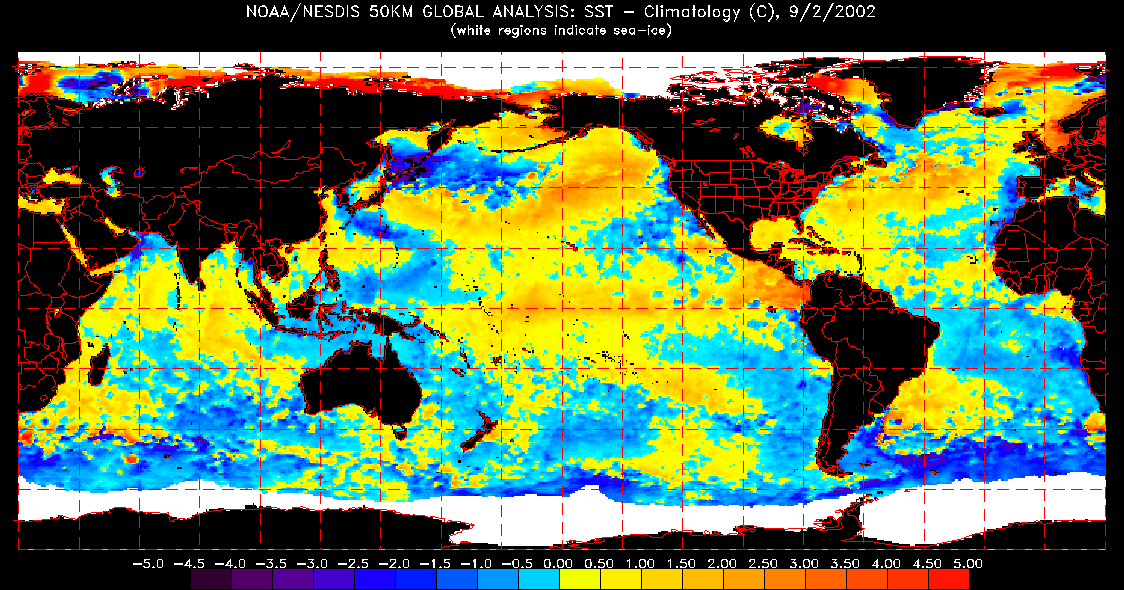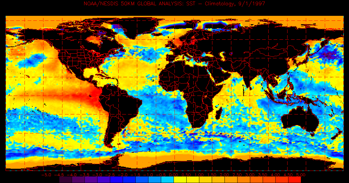 Die Antwort findet sich in natürlichen Vorgängen. Ein Blick auf die globale Wassertemperatur der Ozeane während der vergangenen 15 Jahre, oder seit der maximalen El-Niño-Spitze in den Jahren 1997 und 1998, zeigt die Antwort. Am 1. September 1997 waren die Ozeane der Nordhemisphäre überwiegend zu warm, die der Südhemisphäre kühler, wie die folgende Abbildung zeigt: