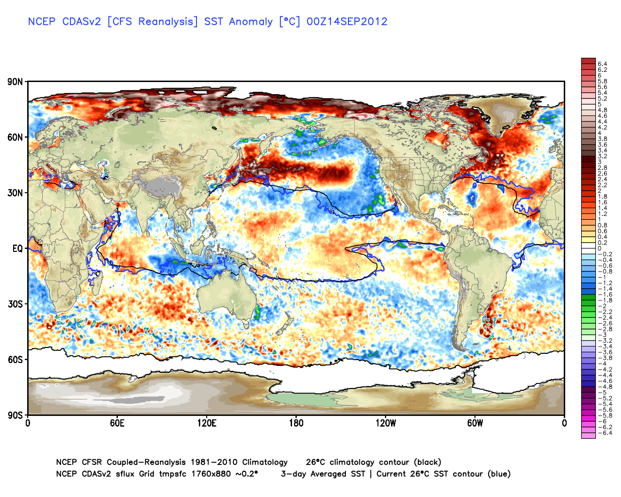 Die gegenwärtige Anomalie der Wassertemperatur zeigt sehr warmes Wasser im [westlichen] Nordatlantik, eine Folge der Warmphase des atlantischen Zyklus’ ähnlich dem in den fünfziger Jahren, in dem wir uns befinden, und dies setzt der Eiskappe weiter zu.