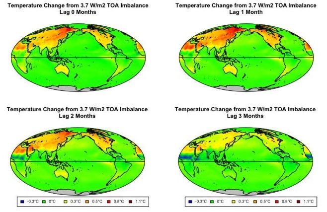 Abbildung 2 zeigt die Temperaturänderung infolge eines [Ungleichgewichtes von?] 3,7 W/m² mit verschiedenen Zeitverzögerungen. Wenn sich die TOA-Strahlung ändert, reagiert die Oberfläche (Land oder Meer) nicht sofort. Bei der Untersuchung der Reaktion bei verschiedenen Zeitverzögerungen können wir die charakteristischen Zeitverzögerungen von Land und Meer sehen.