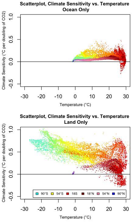 Abbildung 3 schließlich zeigt die Beziehung zwischen der Klimasensitivität und der Temperatur. Wegen des großen Unterschieds zwischen Festland und Ozean zeige ich sie getrennt.