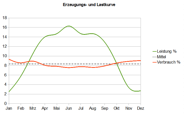 Auf der Grafik des Lastgangs kann man leicht sehen, dass etwa vier mal mehr Kapazität auch im lichtschwachen Winter noch genügend Strom erzeugt würde.