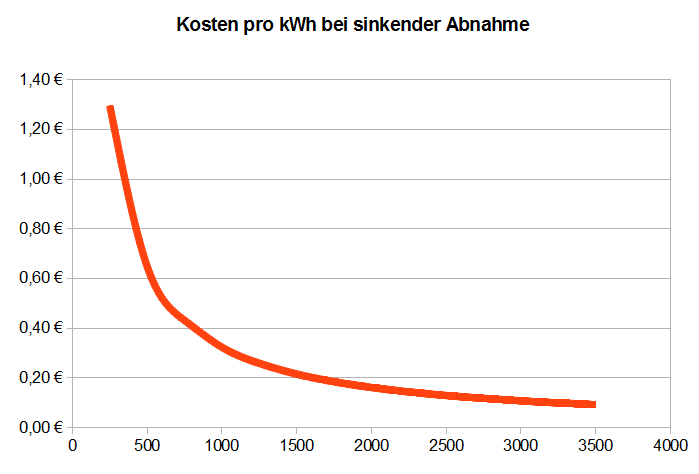 Diese Kostenstruktur hat dann aber auch enorme Auswirkungen auf den kWh Preis, den der Versorger verlangen muss, um bei einer verringerten Abnahme des Kunden bei einer reinen kWh-Abrechnung auf seine (Fix-) Kosten zu kommen:
