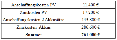 Bei den Anschaffungskosten für 2 Akkusätze von 445.800 € müssten bei einem Preis von 100 € 4.458 Bleiakkus in 20 Jahren angeschafft werden. Das erscheint mir eindeutig zu hoch. Wie der Autor auf diese Zahlen kommt, kann ich aus den Angaben im Text nicht erschliessen.