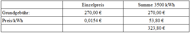 Warum? Weil wie beim Telefon die eigentliche Leistung gegenüber den Fixkosten kaum ins Gewicht fällt. Zumindest wäre es aber aufgrund der Kostenstruktur richtig, eine sehr hohe Grundgebühr und einen sehr niedrigen kWh-Preis zu verlangen. Das würde für den typischen Haushalt mit 3500 kWh Verbrauch/Jahr ohne Steuern und Abgaben so aussehen wie in folgender Tabelle dargestellt.