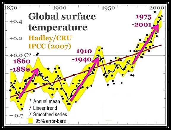 Die drei Dekaden oder mehr mit den stärksten Erwärmungsraten waren 1860 – 1880, 1910 – 1940 und 1976 – 2001. Nur die letzte dieser drei Perioden kann von uns verursacht worden sein, zumindest teilweise.