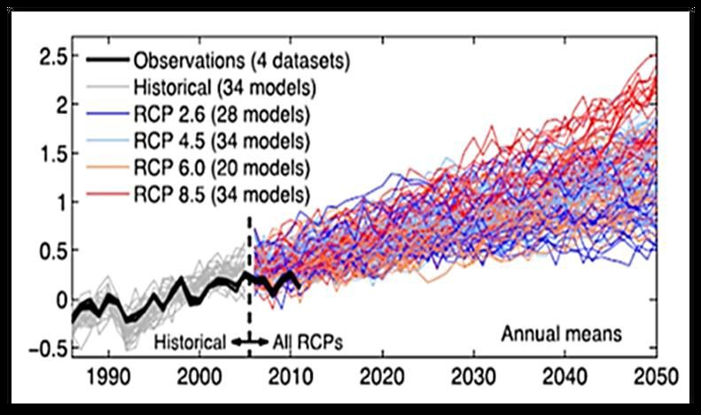 Abbildung 5: Projektionen der globalen Erwärmung bis zum Jahr 2050 (grau oder farbig) im Vergleich zur gemessenen Temperatur (Schwarz). Quelle: IPCC (2013) Entwurf