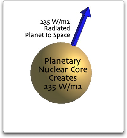 Zu Beginn möchte ich ein kurioses Beispiel eines Treibhauseffektes zeigen, nämlich den eines Stahl-Treibhauses. Man stelle sich einen Planeten im Vakuum des Weltalls vor. Ein Überbleibsel nuklearen Materials, das im Erdkern zerfällt, erwärmt den Planeten so weit, dass er eine Strahlung von, sagen wir, 235 W/m² abstrahlt. Abbildung 1 verdeutlicht das.