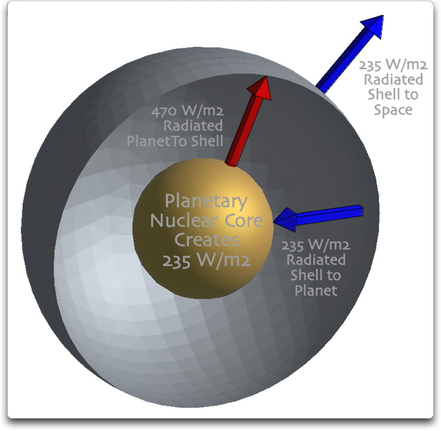 (Aktualisierung: In den Kommentaren zum Vorschein kommende Missverständnisse glauben, dass ich Klarheit vermissen lasse. Hierzu möchte ich Folgendes sagen: Weil die Differenz der äußeren Oberfläche der Hülle und der Planetenoberfläche nur etwa 0,3%* ausmacht, mache ich die vereinfachende Annahme, dass beide Oberflächen gleich sind. Dies klärt die Lage um großen Teil. Ja, damit kommt ein gewaltiger Fehler von 0,3% in die Berechnungen. Über diesen Fehler haben sich die Kommentatoren lang und breit ausgelassen, als ob er etwas bedeuten würde… Wirklich, Leute, 0,3%? Ich mache auch die vereinfachende Annahme, dass sowohl der Planet als auch die Hülle „Schwarzkörper“ sind, soll heißen, sie absorbieren die gesamte auftreffende Infrarotstrahlung).