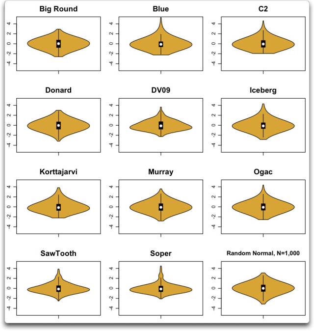 Abbildung 2: Violin-Plots der Daten aus Abbildung 1, aber nach der Log-Transformation und Standardisierung. Die Randwert-Normalverteilung unten rechts dient Vergleichszwecken.