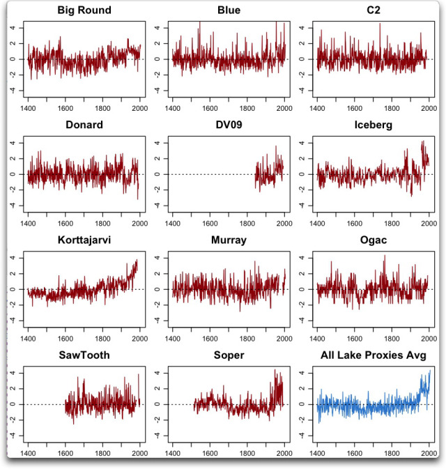 In Übereinstimmung mit der totalen und vollständigen Sturheit der Paläoklima-Gemeinschaft verwenden sie die berühmteste Reihe von Mann et al. 2008: die kontaminierten Korttajarvi-Sedimente. Die Probleme dieser Reihe sind in Skeptiker-Blogs nur allzu bekannt, und Ross und ich haben darüber in einem Kommentar bei PNAS berichtet. Die Original-Autorin, Mia Tiljander, warnte vor der Verwendung des jüngsten Teils dieser Daten, waren doch die Sedimente durch modernen Brückenbau und die Landwirtschaft kontaminiert worden. Obwohl die Schwächen dieser Reihe als Proxy Lesern „skeptischer“ Blogs gut bekannt sind, haben die Begutachter bei Nature offenbar keine Einwände gegen die Berücksichtigung dieses Proxy für eine Temperaturrekonstruktion gehabt.