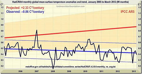 Die Diskrepanz zwischen den Projektionen im 5. Zustandsbericht des IPCC (rote zentrale Projektion im Bereich der orangenen Region) und das Ergebnis in HadCRUT4 (blaue Trendlinie) ist alarmierend. Die Differenz zwischen der beobachteten Abkühlung von 0,86°C pro Jahrhundert und der vorhergesagten Erwärmung von 2,33°C pro Jahrhundert ist äquivalent mit unglaublichen 3,2°C pro Jahrhundert.