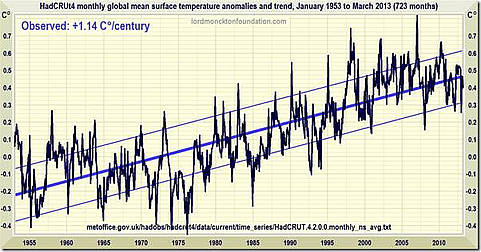 Die lineare kleinste-Quadrate-Regression über die gesamte 1959 Monate lange Periode zeigt eine Erwärmung äquivalent mit 0,47°C pro Jahrhundert, also mitten im Bereich der natürlichen Variabilität des Klimas. Das 95%-Vertrauensintervall (2 σ) liegt zwischen 0,33 und 0,6°C pro Jahrhundert, was durch die Trendlinien um den zentralen Trend gezeigt wird.