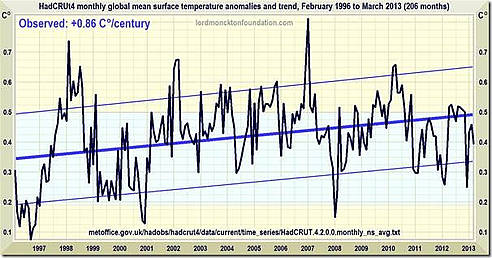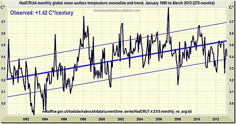 „Beobachtungen, die vom Hadley Centre des Met. Office und von der Climate Research Unit der University of East Anglia gesammelt worden sind, zeigen, dass die Rate der globalen Temperaturzunahme zwischen 1975 und 1988 ähnlich den Raten zwischen 1860 und 1880 sowie zwischen 1910 und 1940 waren (etwa 0,16°C pro Jahrzehnt) …“