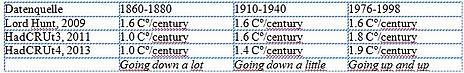 Eine Version von HadCRUt3, die in jüngerer Zeit in Lord Hunts Antwort eine Rolle spielte, zeigt Erwärmungsraten von jeweils 1,0; 1,6 und 1,8°C pro Jahrhundert während dieser drei Perioden. In HadCRUt4 setzt sich diese Manipulation fort, zeigen sich doch dort Erwärmungsraten äquivalent zu jeweils 1,0; 1,4 und 1,9°C pro Jahrhundert. Die folgende aufschlussreiche Tabelle fasst die Änderungen zusammen: