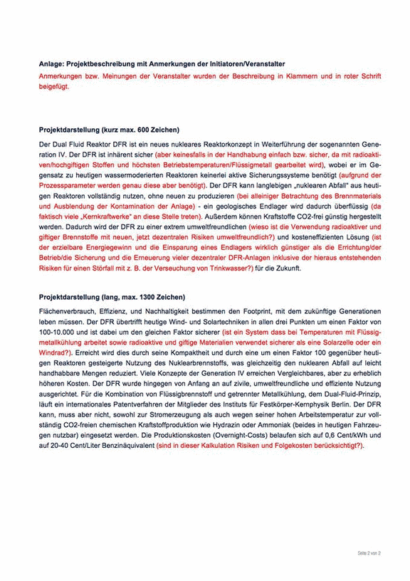 Nach unserer Auffassung ist das Projekt DFR inhaltlich nicht mit den Zielen der Awards vereinbar. Es liefert entgegen der Darstellung keinen Umweltbeitrag sondern erhöht nukleare Entsorgungsrisiken unkontrollierbar. Das Projekt propagiert die Abkehr von einem zentralen Endlager in dezentrale „Kernkraftwerke“ – also radioaktiver Abfall wird dezentral bei Betriebstemperaturen über 1.000 Grad Celsius und flüssigem Metall zur Kühlung energetisch in seinem Abklingverhalten genutzt. In der Darstellung in der Bewerbung wurde allerdings unterschlagen, dass die verwendeten Materialien hoch giftig sind und ihre Umgebung radioaktiv kontaminieren. Da entsprechende Anlagen unmöglich Standzeiten von hunderten von Jahren haben werden, produzieren wir neuen radioaktiven Müll. Wir gehen davon aus, dass das Problem damit größer als die Endlagerung heutzutage und der radioaktive Müll schlechter zu kontrollieren ist. Es erscheint unmöglich, bei mehreren hundert Anlagen sicherzustellen, dass keine Unfälle passieren oder vorsätzliche Anschläge zum Erfolg führen.