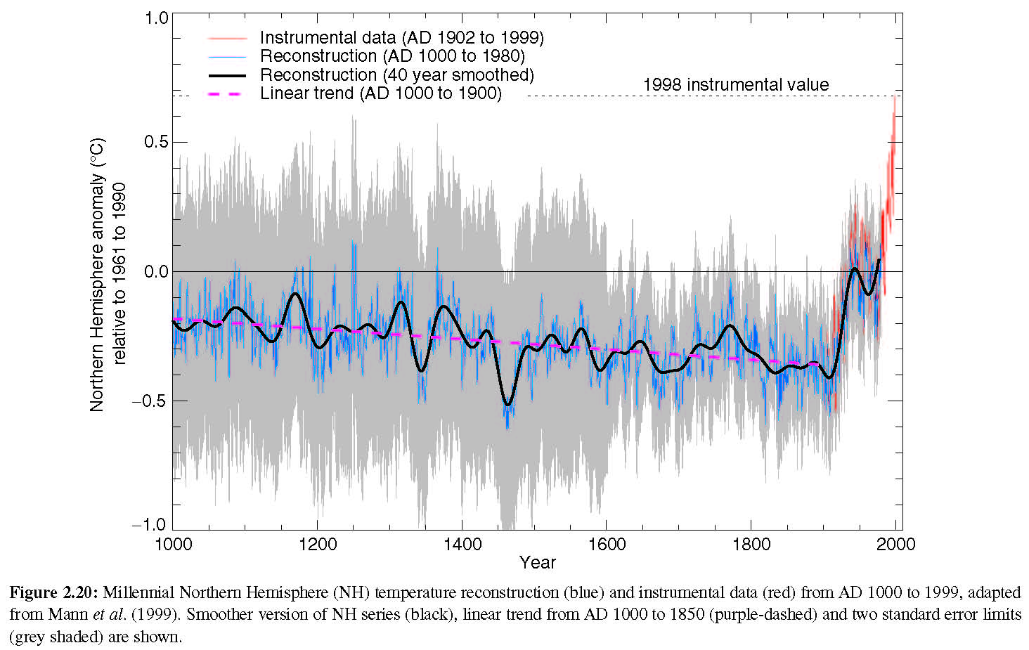 Bild 2: Die ursprüngliche Hockey Stick Kurve von M. Mann. Quelle: IPCC-Bericht des Jahres 2001