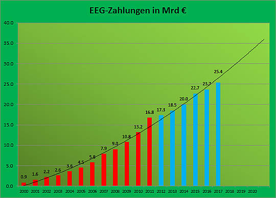 Die Realität sieht jedoch völlig anders aus. Die jährlichen EEG-Zahlungen sind seit der Einführung des Gesetzes Jahr um Jahr mit hohen Raten gestiegen und würden bei Fortsetzung dieses Trends für das Jahr 2020 bereits rund 35 Mrd. € erreichen, Bild 1.