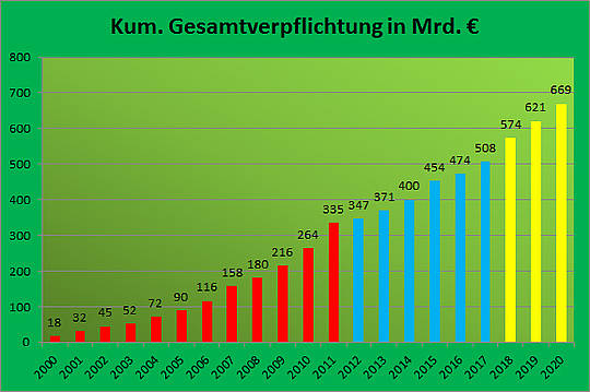 Diese Zahlen spiegeln jedoch längst noch nicht den tatsächlichen Umfang der Kosten wider. Hinter jeder Jahreszahlung versteckt lauern die damit verknüpften Langzeitverpflichtungen über einen Zeitraum von 20 Jahren, welche die Politik im EEG den Anlagenbetreibern zugesichert hat. Rechnet man diese Gesamtverpflichtungen für die nächsten Jahre einmal zusammen, so ergibt sich für Deutschland eine Kostenbelastung, die sich bis zum Jahr 2020 auf insgesamt rund 670 Mrd. € summieren dürfte, Bild 2. Für den klassischen 4-Personen-Arbeitnehmerhaushalt entspricht dies einer Gesamtbelastung von über 32.000,- €.