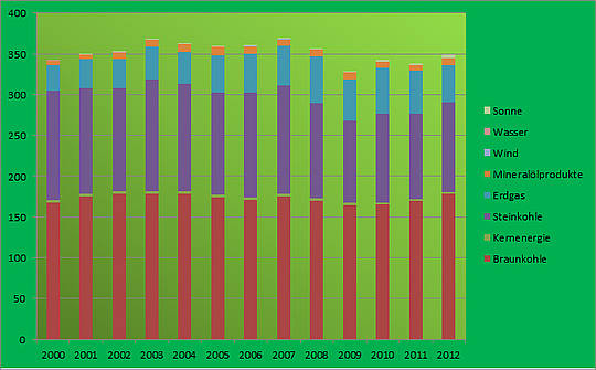 Bild 3. Die jährlichen CO2-Emissionen der Stromerzeugung (in Mio. t CO2) sind trotz der gestiegenen Anteile von Strom aus Sonne, Wind und Biomasse von 2000 bis 2012 Jahren faktisch unverändert geblieben