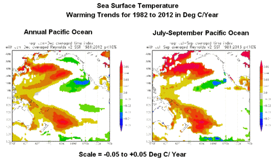 Die linke Karte in Abbildung 10 zeigt die jährlichen Trends der Wassertemperaturen im Pazifik von 1982 bis 2012. Man sieht, dass sich einige Regionen während dieser Zeit erwärmt haben, vor allem in den zentralen und westlichen mittleren Breiten des Nordpazifik. Wenn wir jedoch auf die Trends in den Quartalen mit der höchsten saisonalen arktischen Schmelzrate schauen, also Juli bis September, fallen die Erwärmungsraten in Teilen der höheren Breiten des Nordpazifik ziemlich hoch aus. Das zeigt die rechte Karte in der Abbildung.