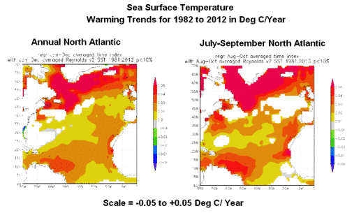 Wir haben auch gezeigt, dass die Wassertemperaturen im Nordatlantik einen zusätzlichen Modus jahreszeitlicher Variabilität aufweisen, bekannt unter der Bezeichnung Atlantische Multidekadische Oszillation AMO. (Weiteres zur AMO bei NOAA/AOML FAQ hier, in meinem Blogbeitrag hier und in meiner Einführung zur AMO hier.) Als Folge hat sich der Nordatlantik seit Mitte der siebziger Jahre auf natürliche Weise mit einer Rate erwärmt, die höher war als in den übrigen Ozeanen, die sich ebenfalls aufgrund natürlicher Ereignisse erwärmt haben und nicht aufgrund von Treibhausgas-Emissionen.