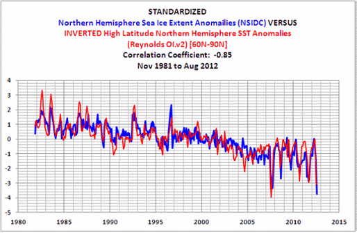 Das führt uns zur Betrachtung des arktischen Meereises. Wir betrachteten die Auswirkungen der Meereis-Ausdehnung auf eine ganze Anzahl von Datensätzen, nämlich Wassertemperatur, Temperatur der unteren Troposphäre und Temperatur an Land in dem Beitrag How Much of an Impact Does the Atlantic Multidecadal Oscillation Have on Arctic Sea Ice Extent? [etwa: wie groß ist der Einfluss der AMO auf die arktische Meereis-Ausdehnung?] Von allen gezeigten Datensätzen war der Datensatz mit der größten Übereinstimmung – der höchsten Korrelation – mit der Eisausdehnung derjenige mit den Anomalien der Wassertemperatur in den hohen Breiten der Nordhemisphäre (60 N bis 90 N). Siehe Abbildung 12! Die arktische Meereis-Ausdehnung und die Wassertemperaturen in hohen Breiten der Nordhemisphäre wiesen einen Korrelations-Koeffizienten von 0,85 auf. Die Korrelationen der arktischen Meereis-Ausdehnung mit den Temperaturanomalien in der unteren Troposphäre und der Anomalien mit den Temperaturen über Land waren viel geringer (beide in hohen Breiten: 60 N bis 90 N).